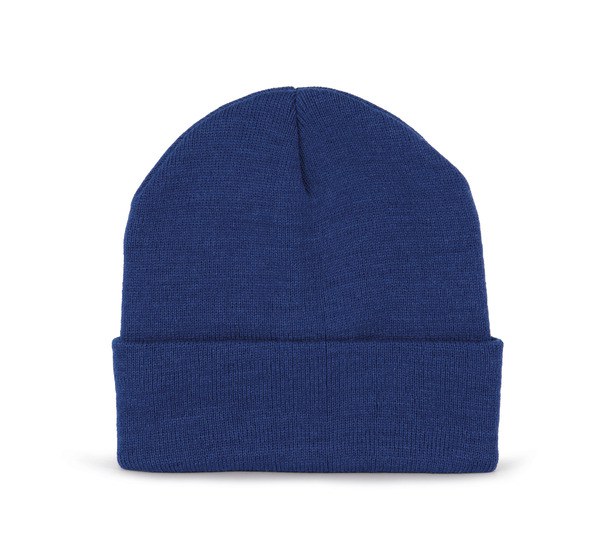 Knitted turn-up beanie made from 50% acrylic and 50% recycled polyester.